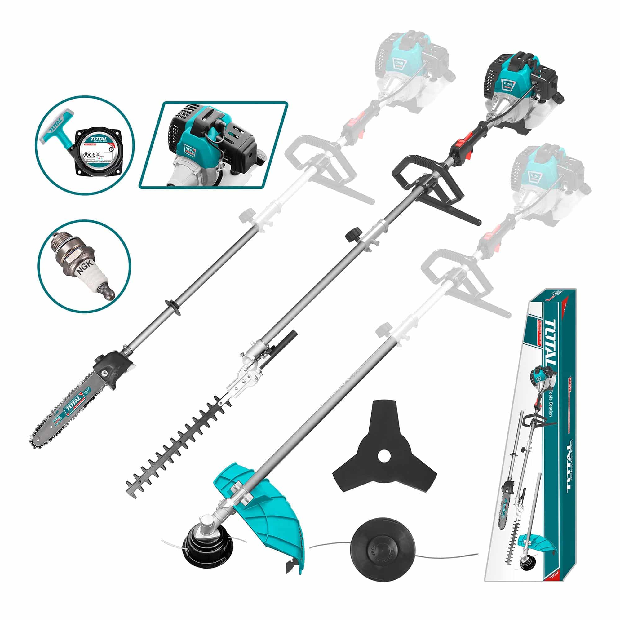 Kit de jardinería Total con motor 2 tiempos 52cc y potencia de 1.4 kW (2.2 HP). Incluye cortabordes con forro de 2.4 mm x 4 m y cuchilla de 255 mm (3 dientes), cortasetos y motosierra. Velocidad máxim