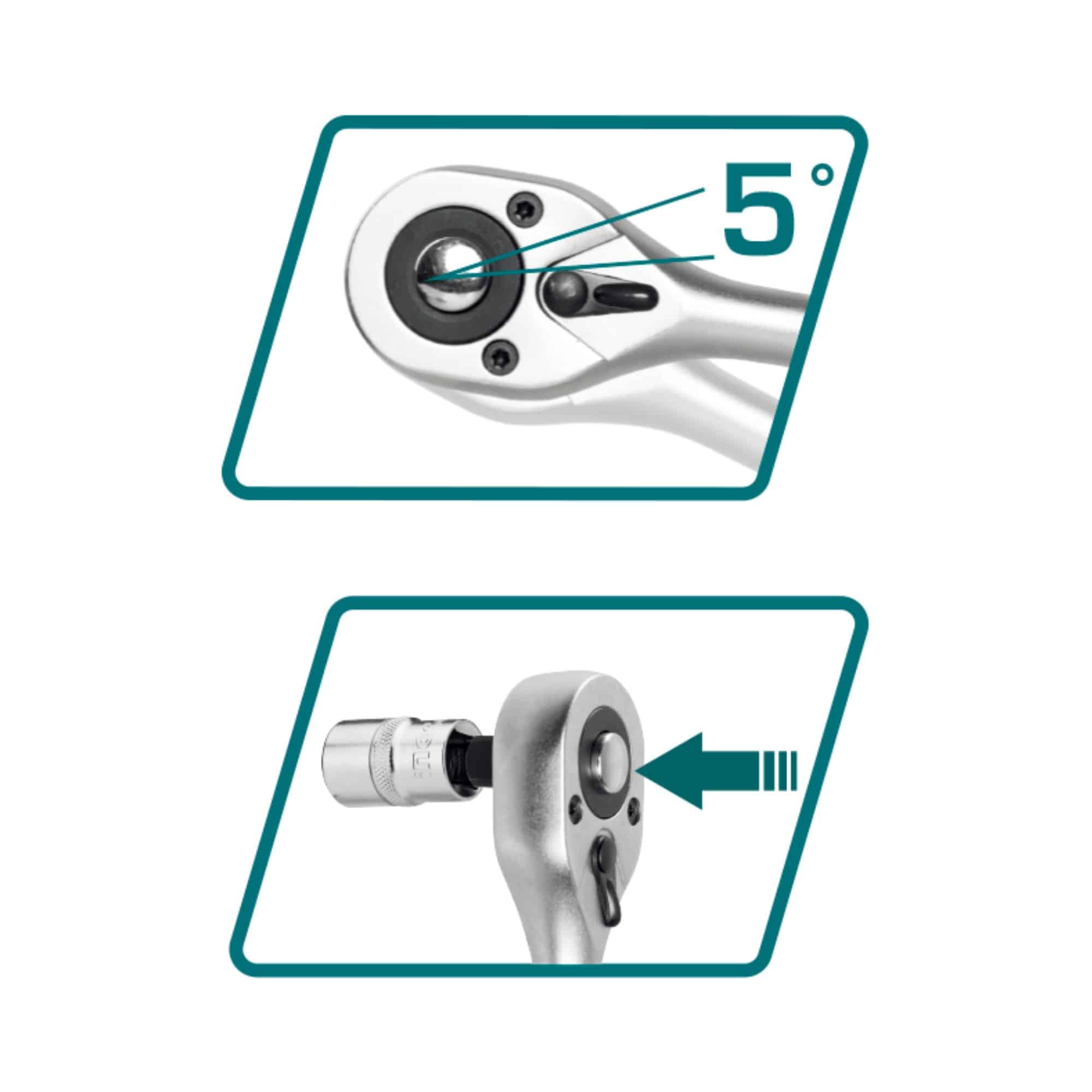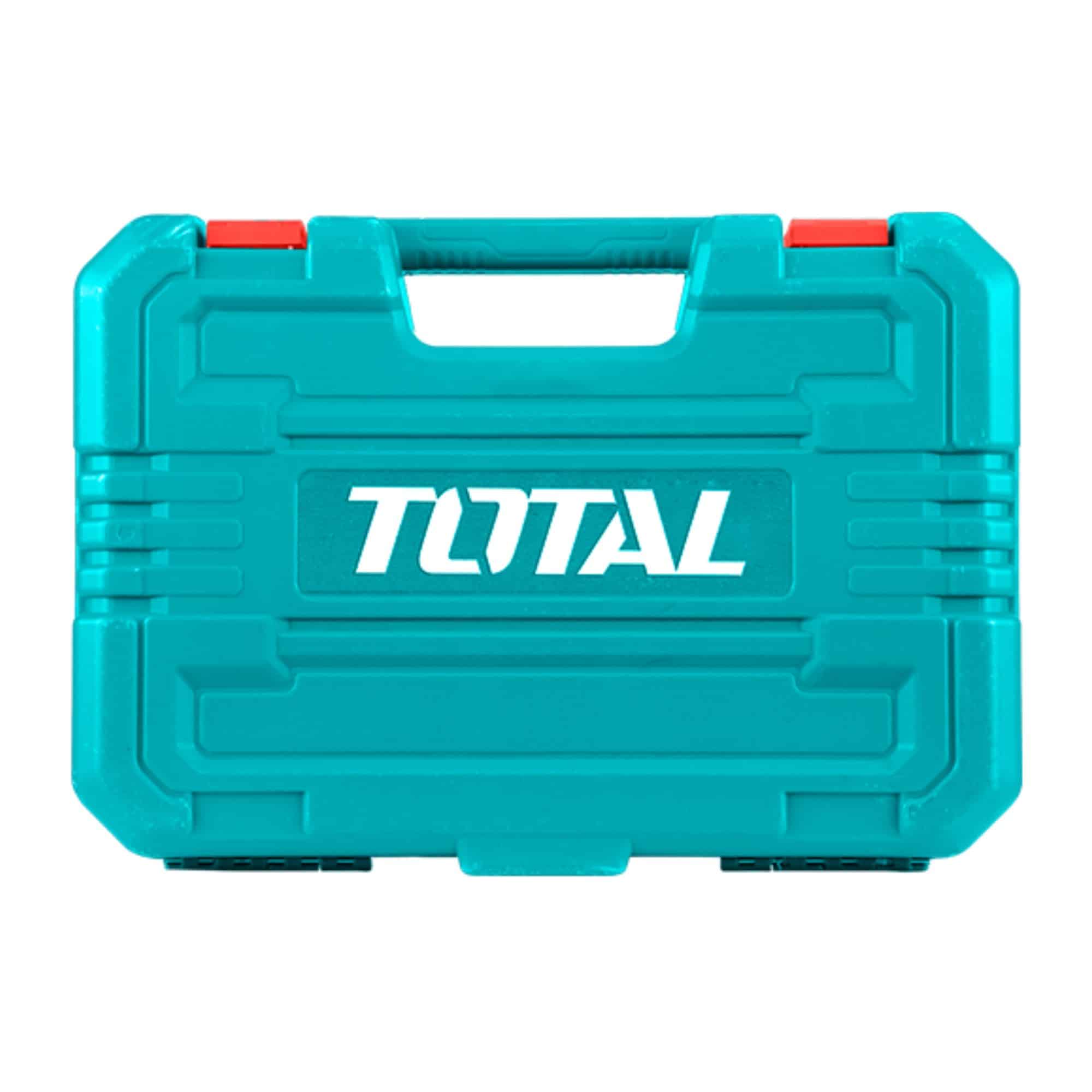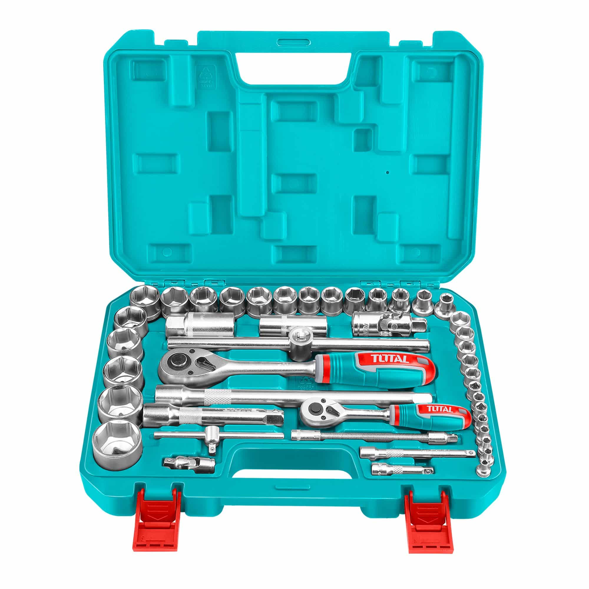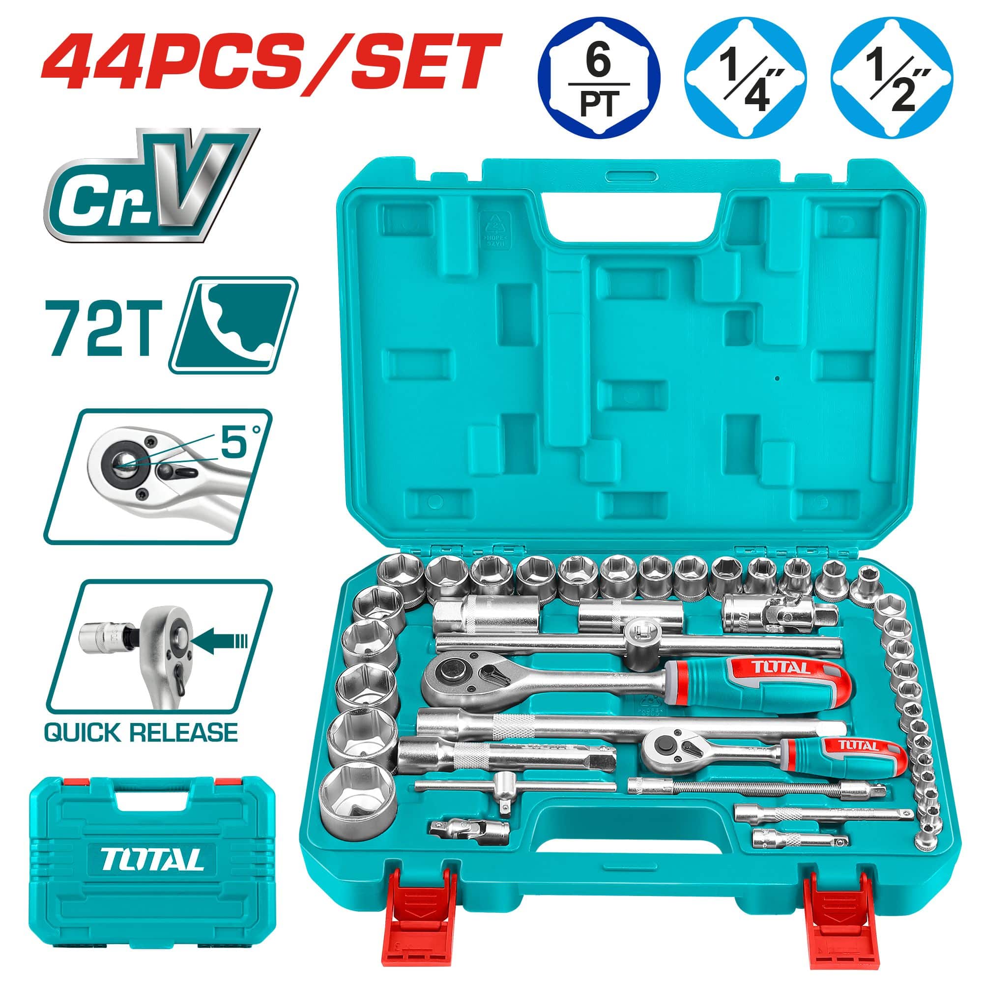 Set de llaves de vaso 44 piezas Total Tools (1/4″ + 1/2″). Incluye carracas, vasos métricos, alargaderas, barras en T y accesorios. Material CR-V tratado térmicamente. Viene en estuche rígido.