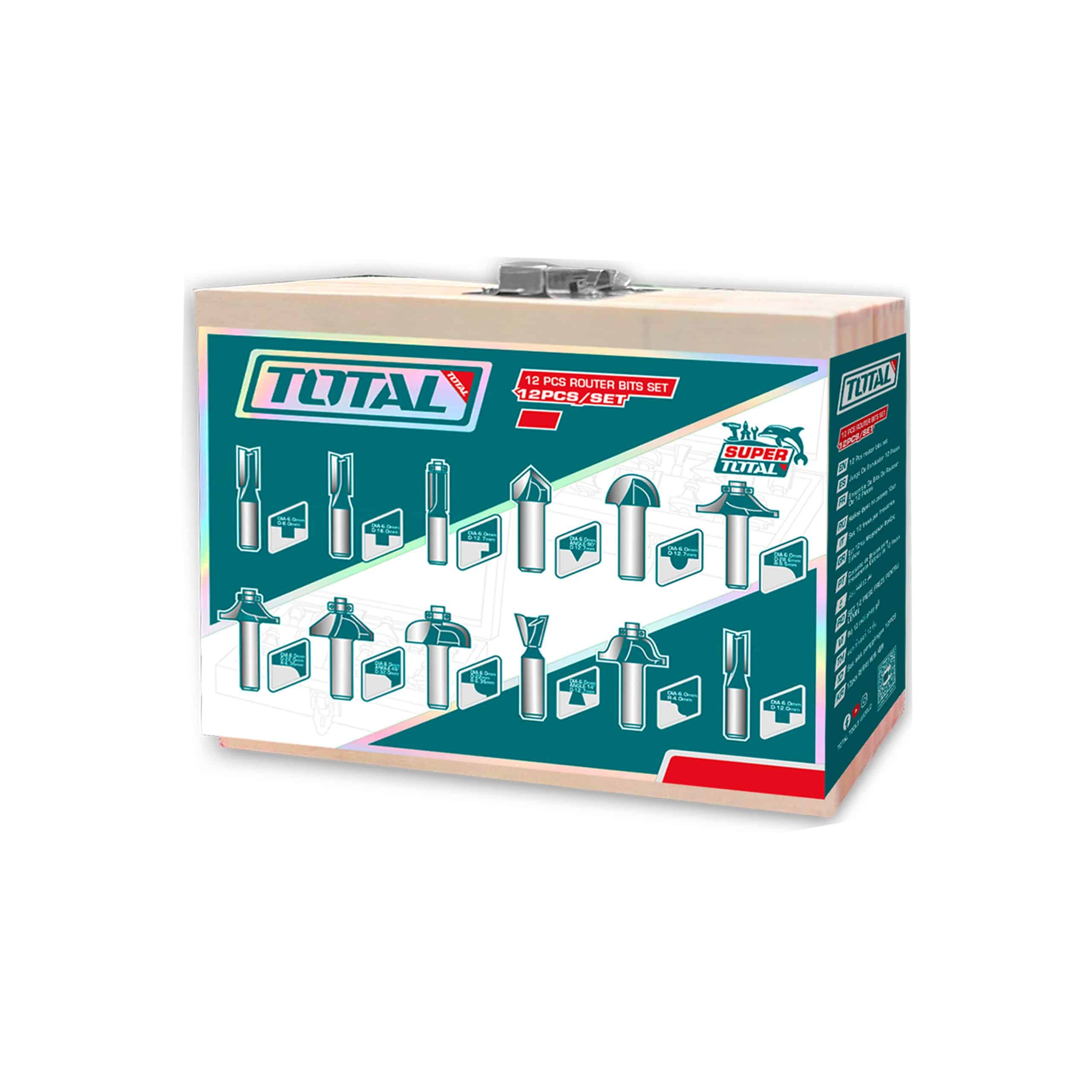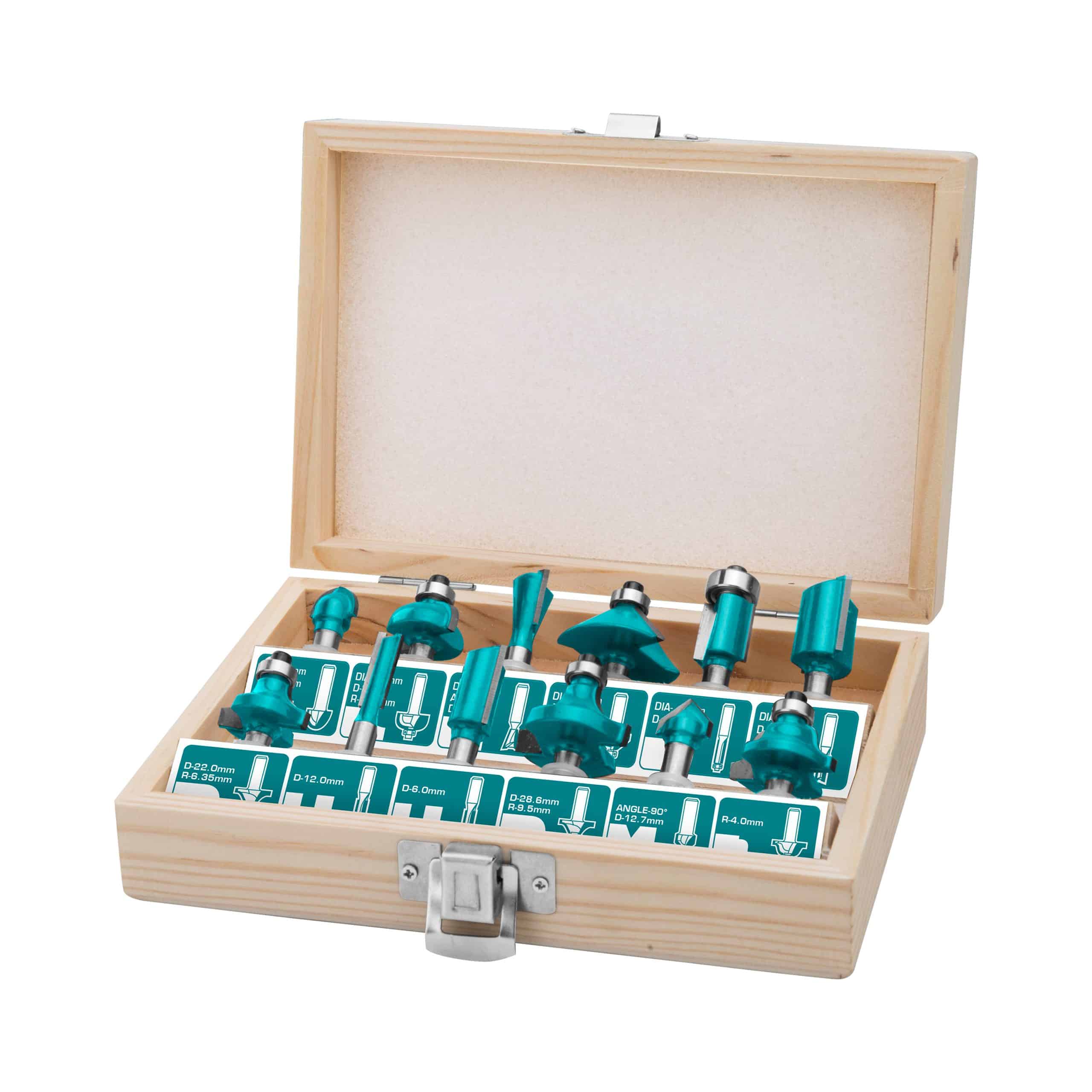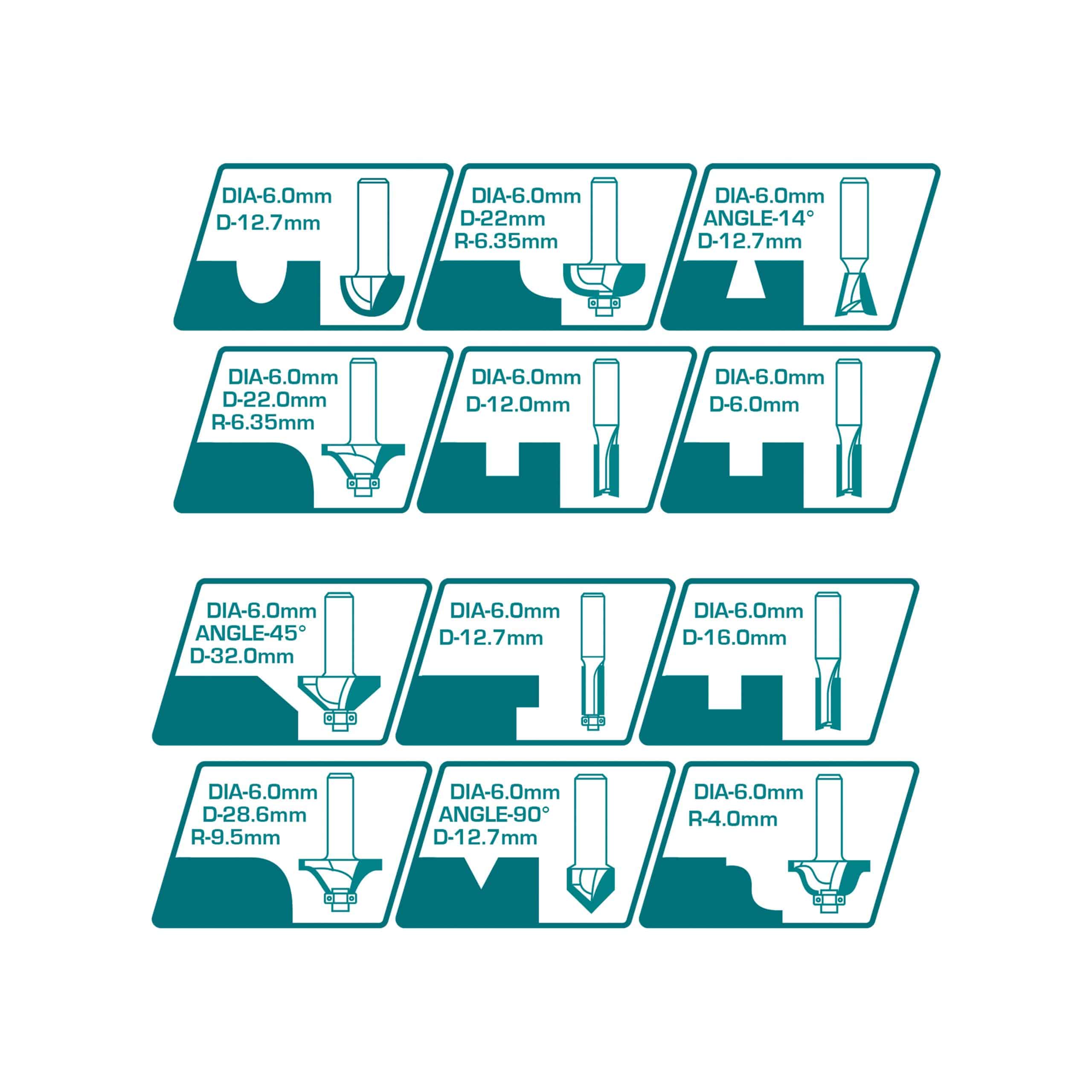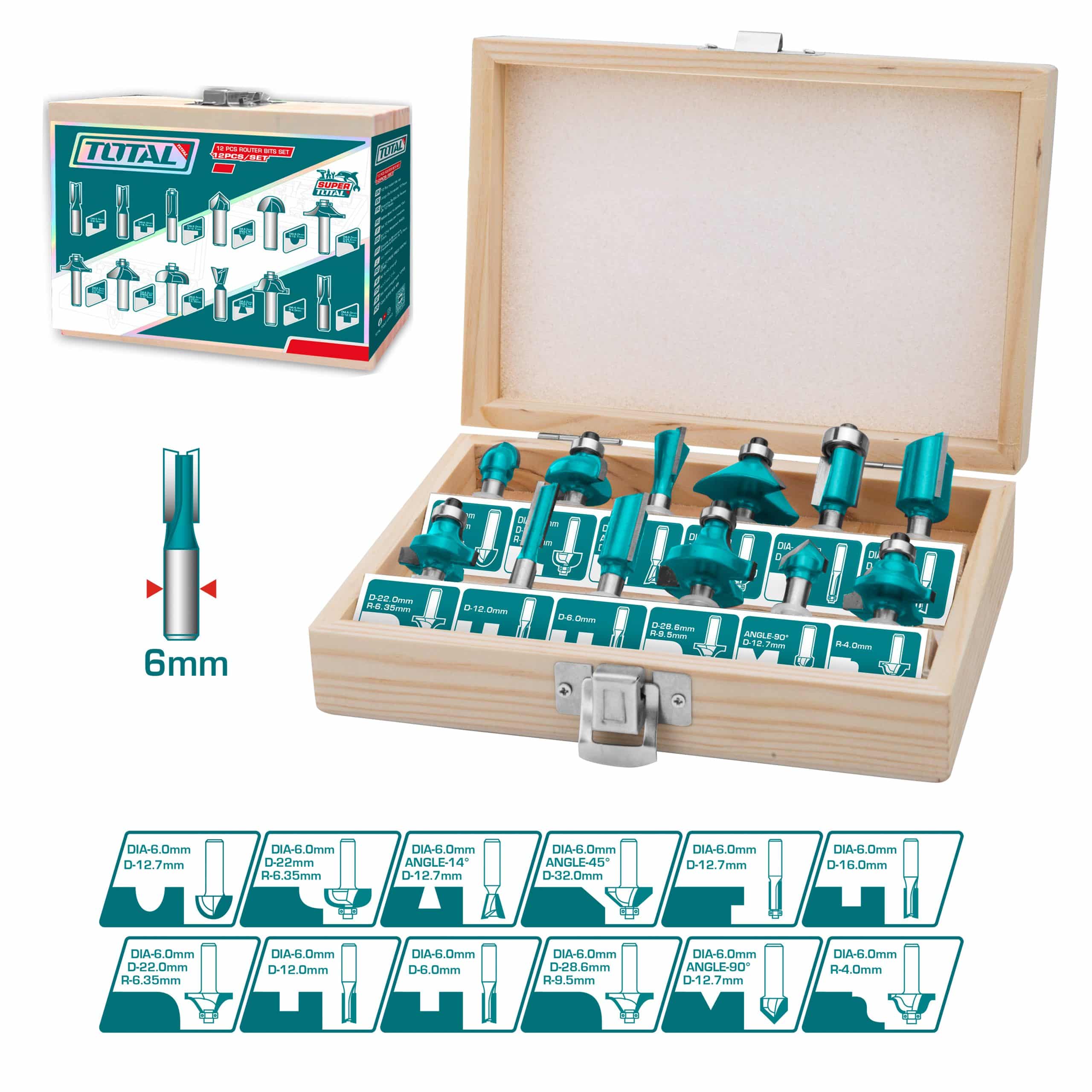 Set de brocas para router Total Tools con mango de 6 mm. Incluye 3 brocas rectas (6, 12 y 16 mm), 1 broca V-groove 90° 1/2″, 1 broca cola de milano 1/2″, 1 broca chamfer 32 mm 45°, 1 broca de enrasar
