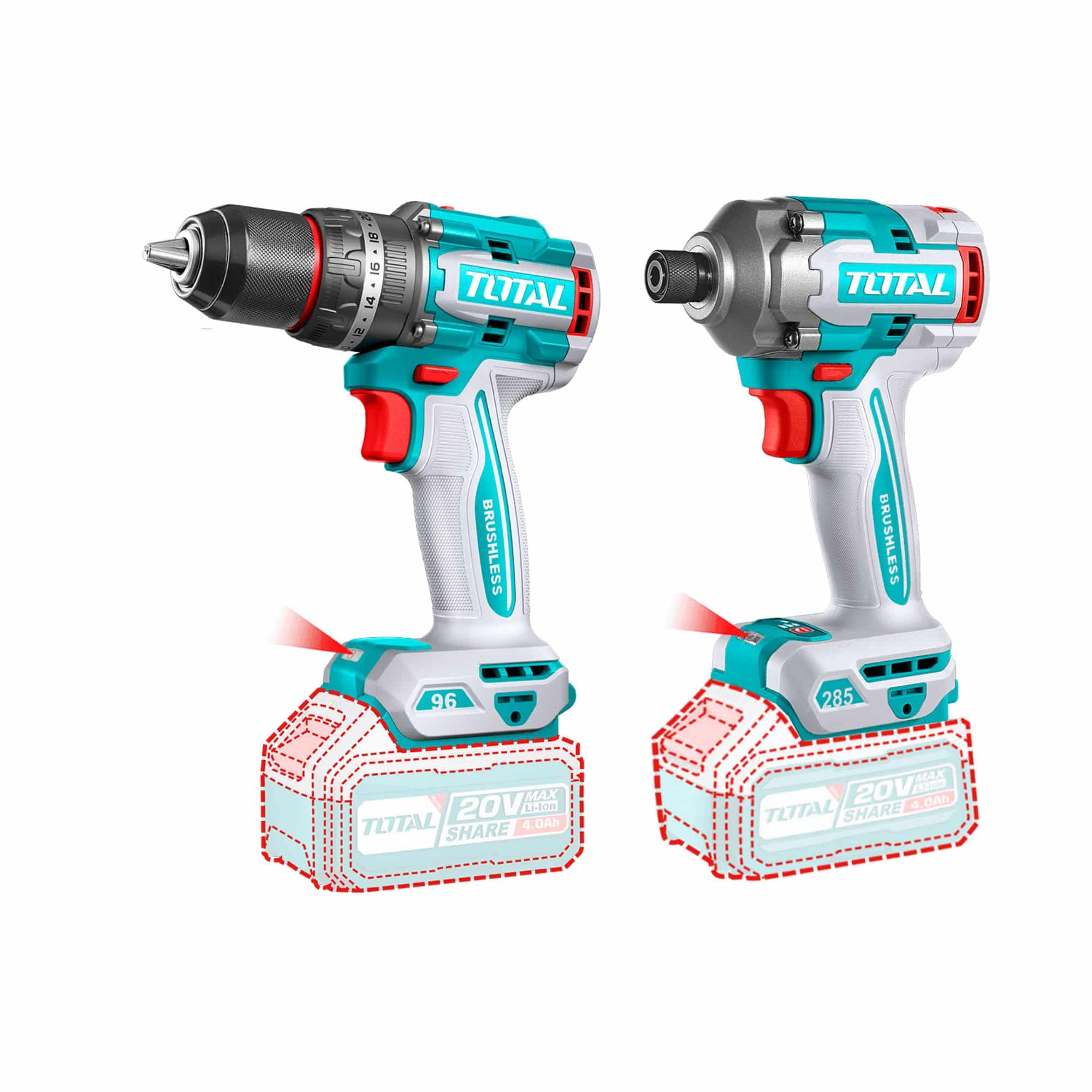 Kit inalámbrico Total 20V con taladro de impacto, atornillador de impacto, sierra circular y linterna LED. Incluye 2 baterías 4.0Ah, cargador rápido y set de brocas. Ideal para trabajos profesionales
