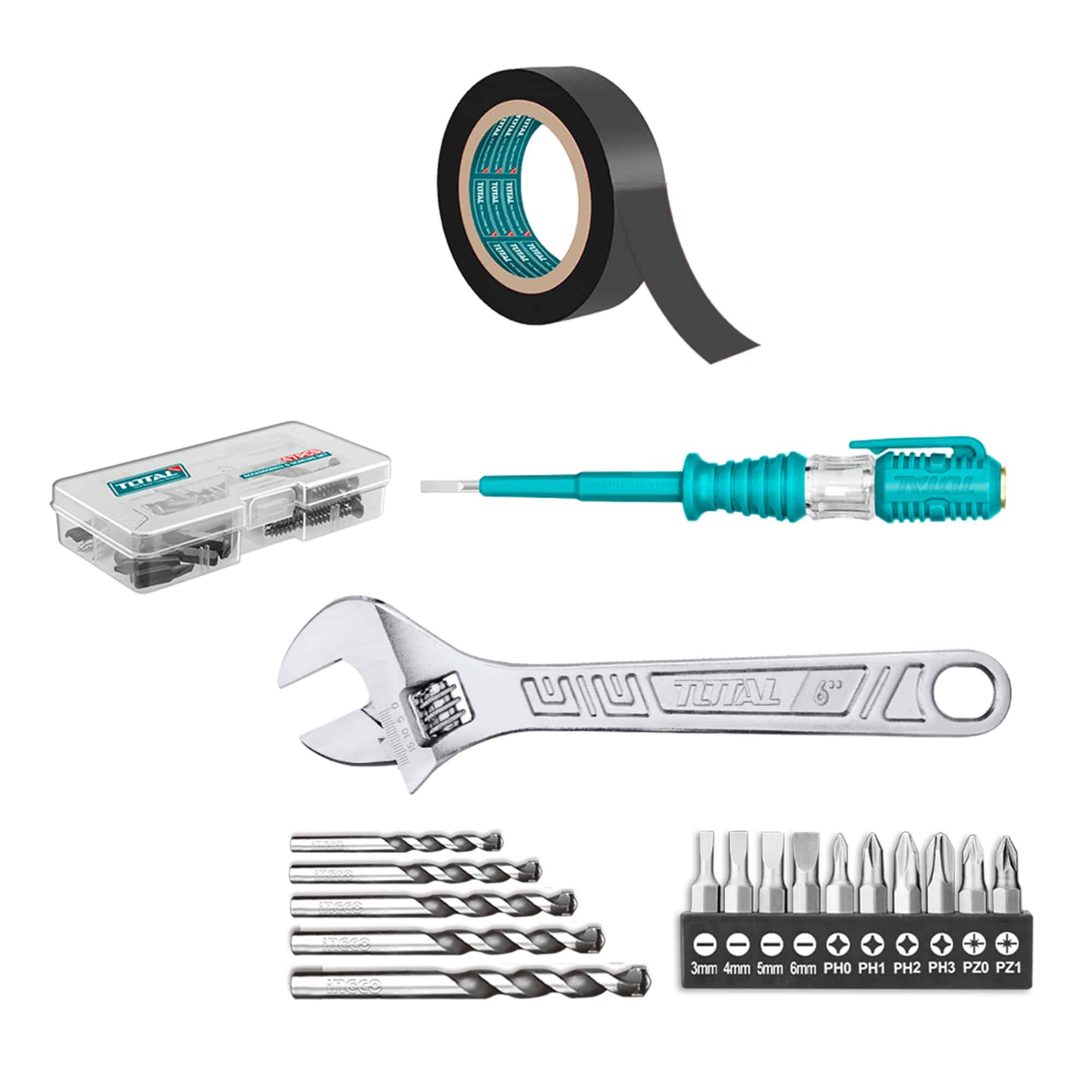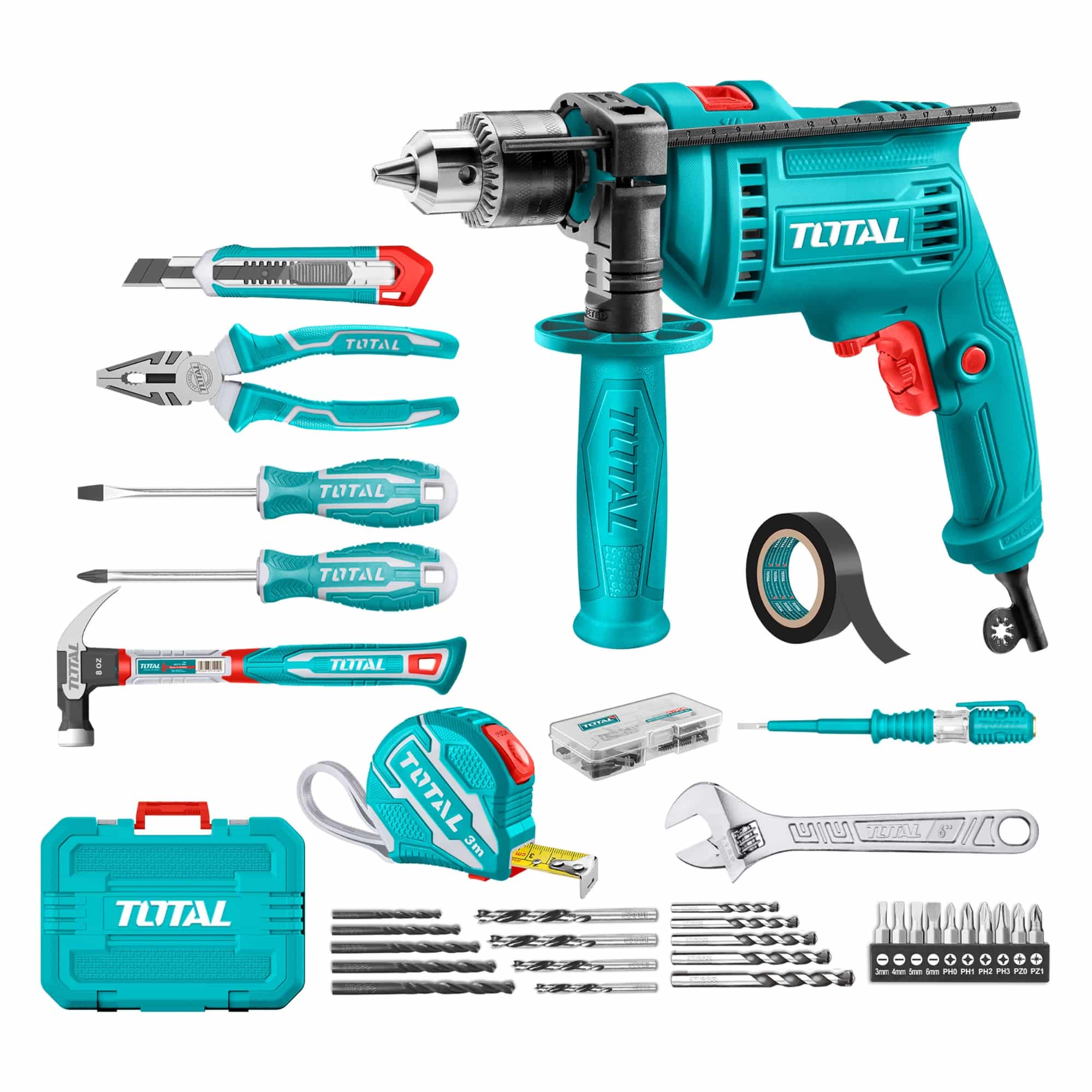 Set de herramientas de 115 piezas con taladro de impacto de 680W. Incluye accesorios esenciales como brocas, martillo, alicates, destornilladores y más. Ideal para trabajos de bricolaje, reparaciones