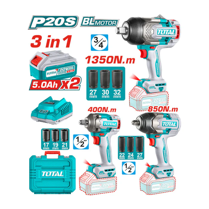 Kit Llaves de Impacto Inalámbrica 400Nm – 850Nm – 1350Nm 20V