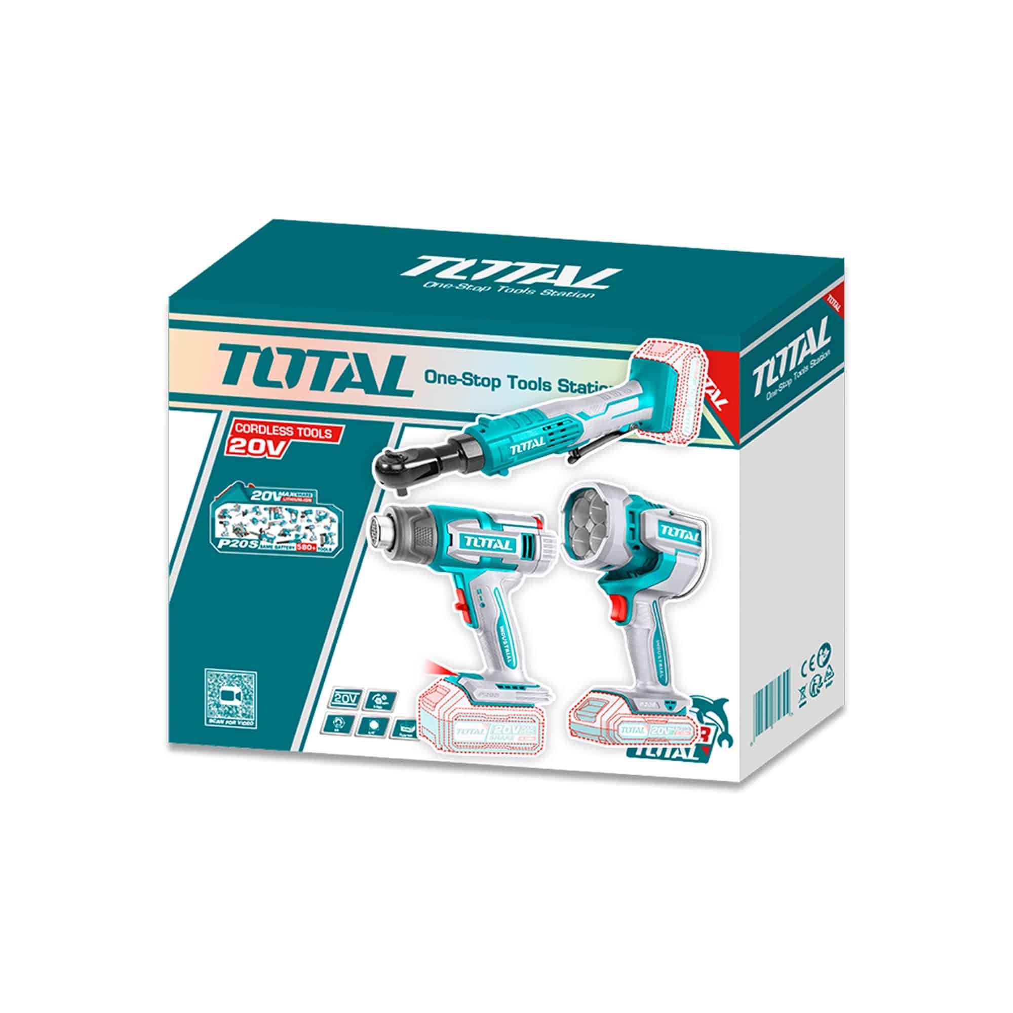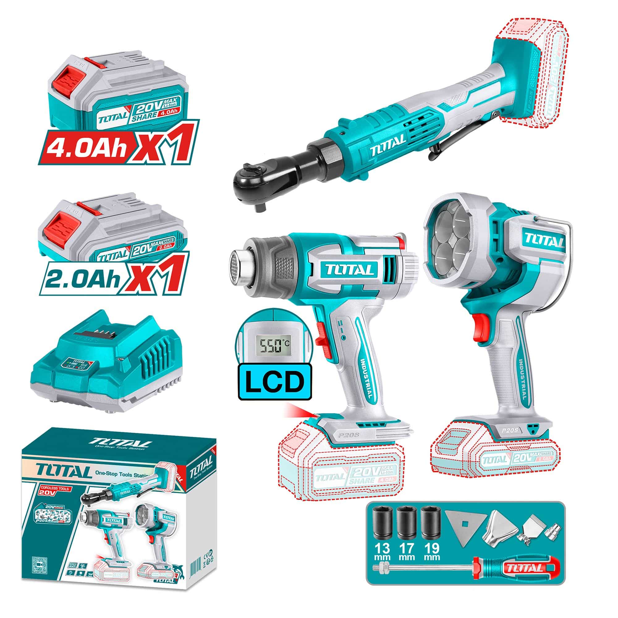 Kit Total inalámbrico: chicharra 65Nm, linterna LED 2000lm, pistola de calor 550°C. Incluye baterías 2.0Ah y 4.0Ah, cargador y accesorios.