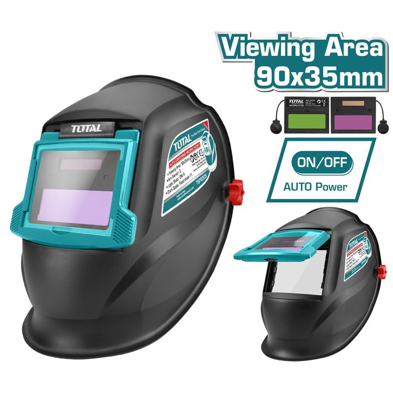 Mascara fotosensible para soldar Total Tools. Área de visión 90×35 mm, tono DIN 11, alimentación solar con batería recargable. Tiempo de reacción 1/5000s.