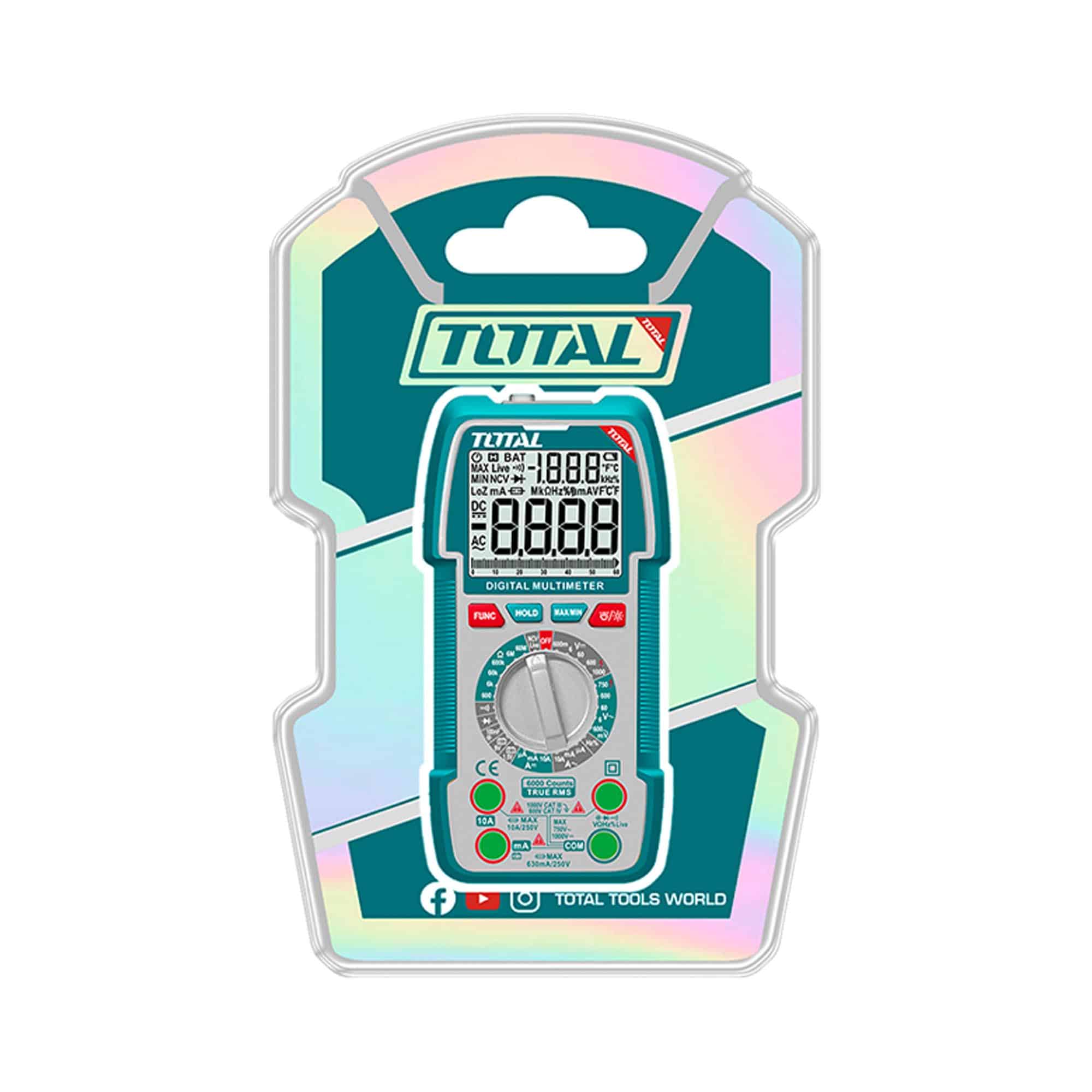 Multímetro digital Total Tools TMT5310002 con medición AC/DC hasta 1000V, resistencia 60MΩ, capacitancia 100mF, frecuencia 10MHz, NCV, prueba de diodos y linterna integrada. Incluye 3 pilas AAA.