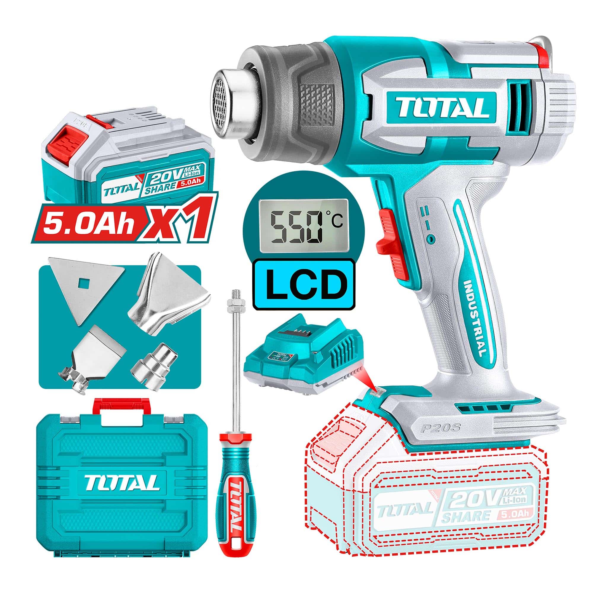Pistola de calor Total 20V con temperatura ajustable y pantalla LCD. Incluye batería 5.0Ah, cargador y boquillas. Precisa para trabajos de calefacción y secado.