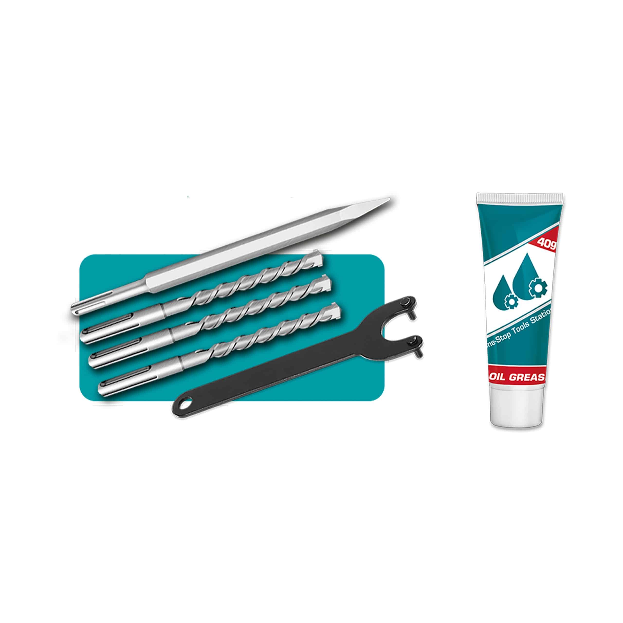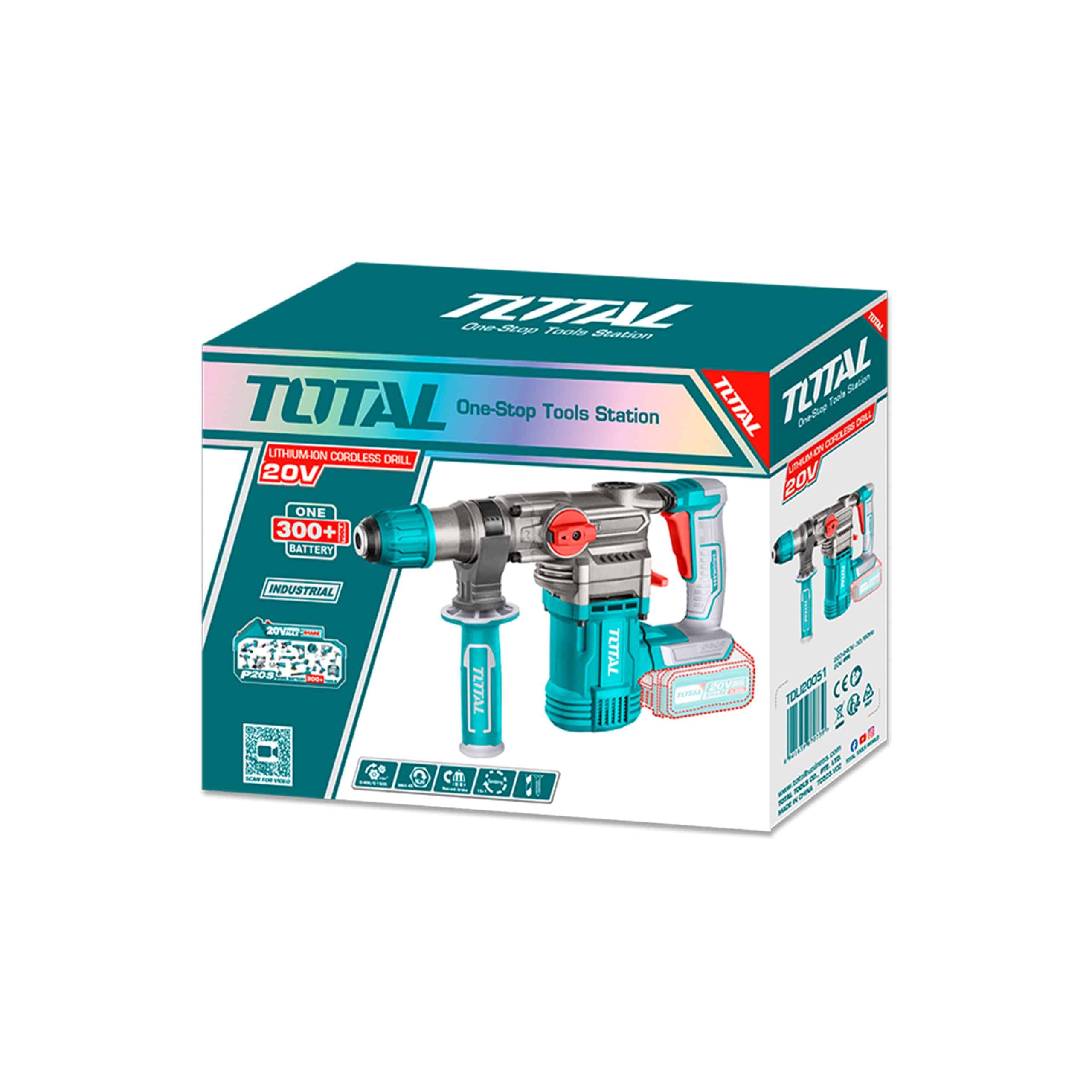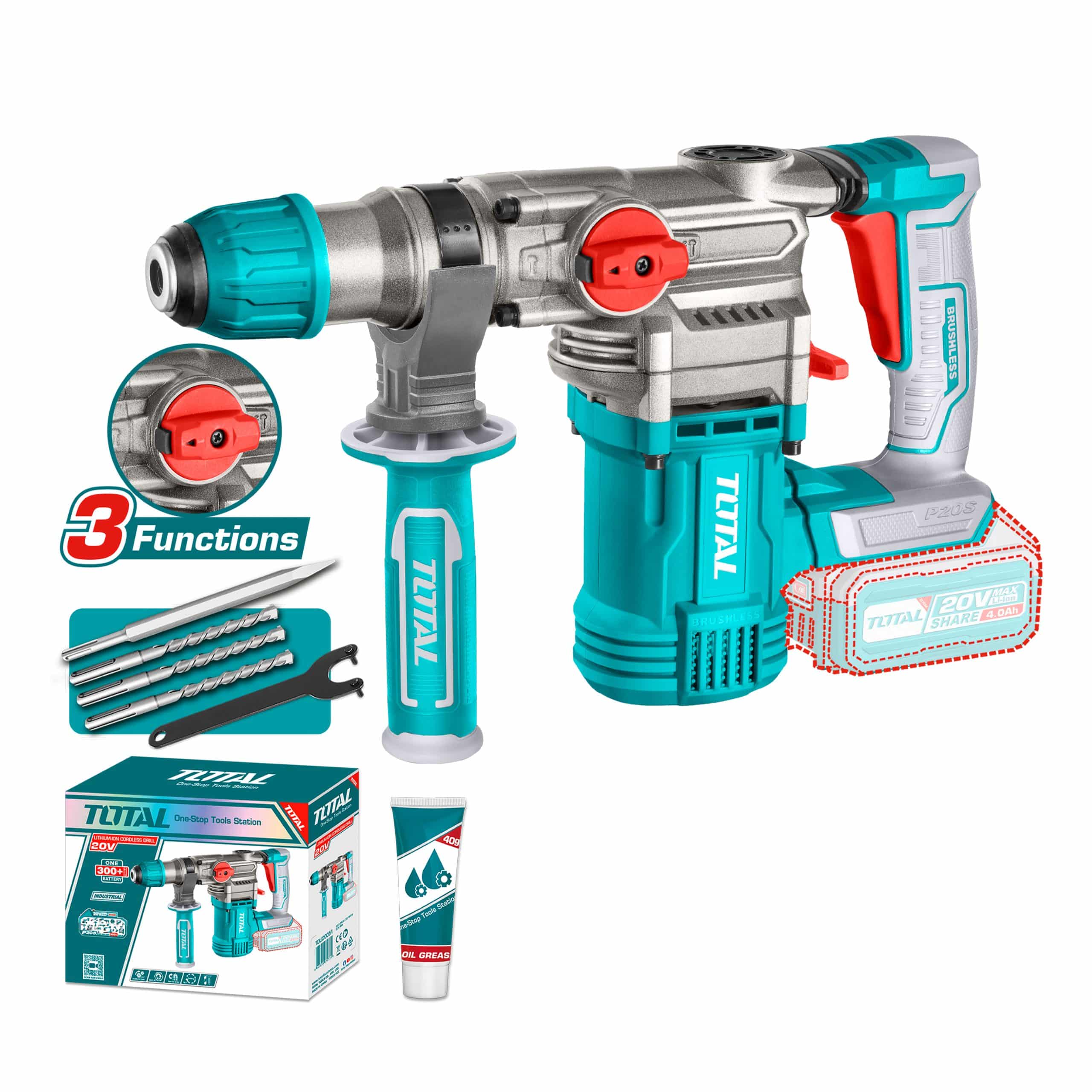 Rotomartillo Total SDS Plus 20V Brushless. Fuerza de impacto 4.5J, incluye 3 brocas y 1 cincel. Batería y cargador se venden por separado.