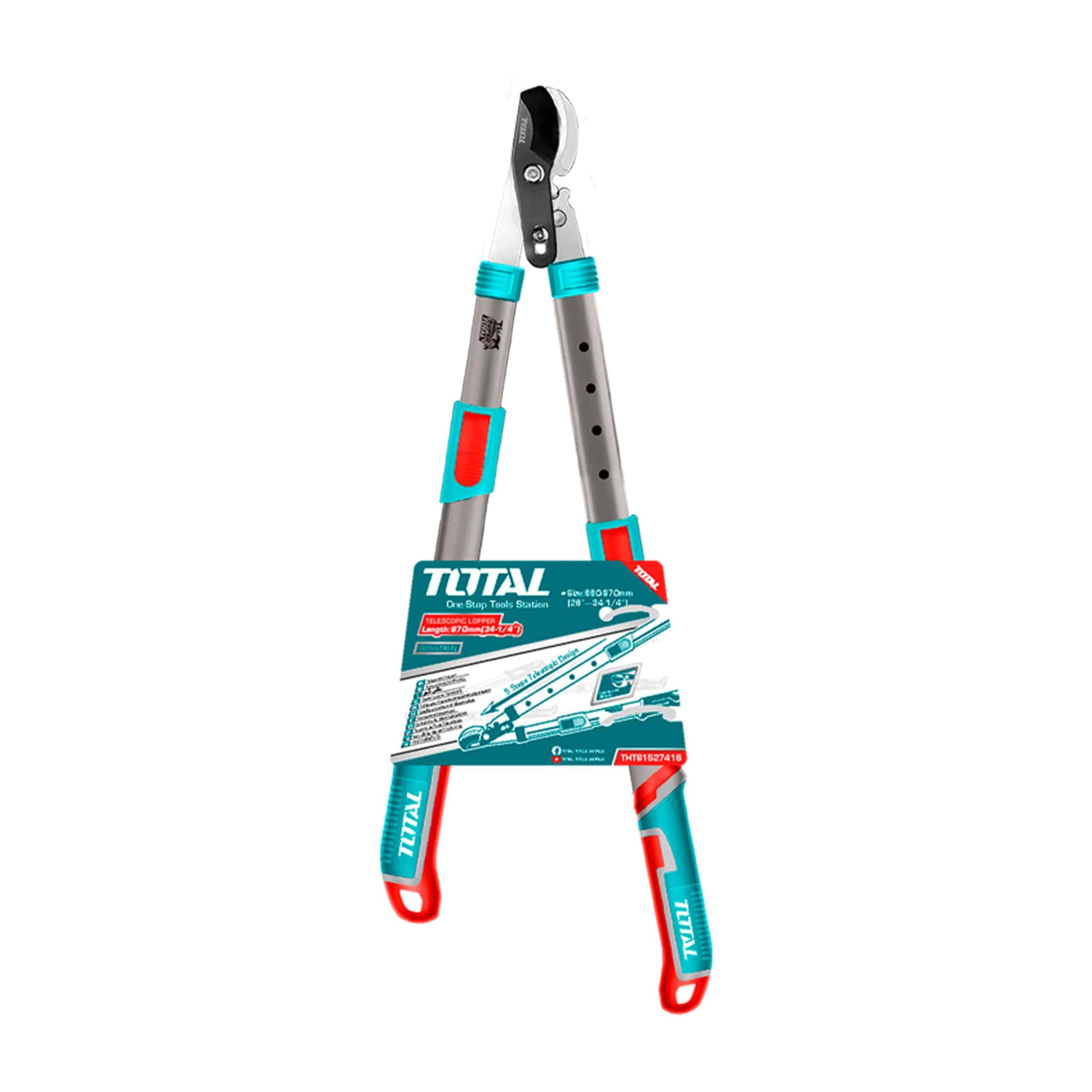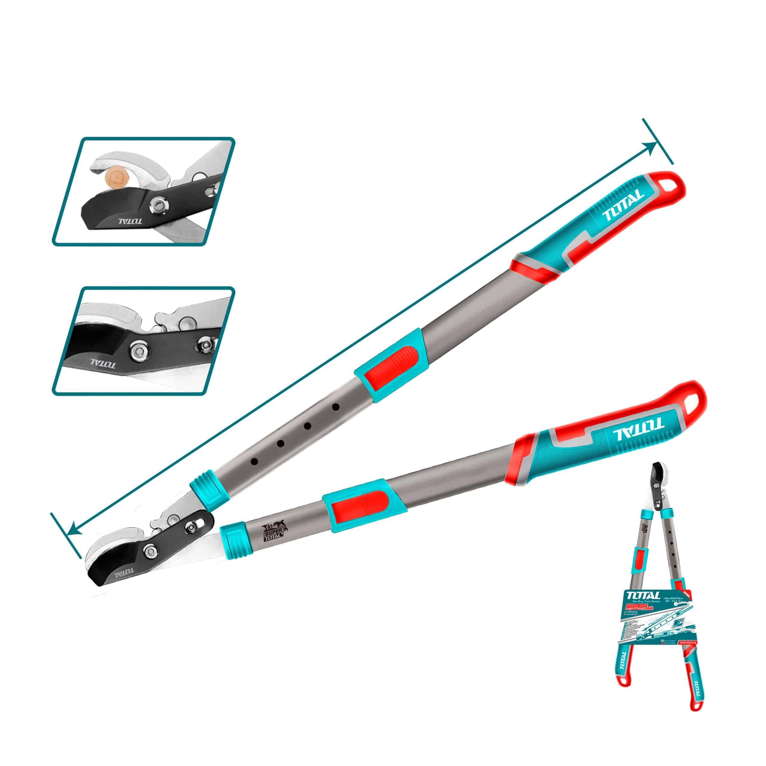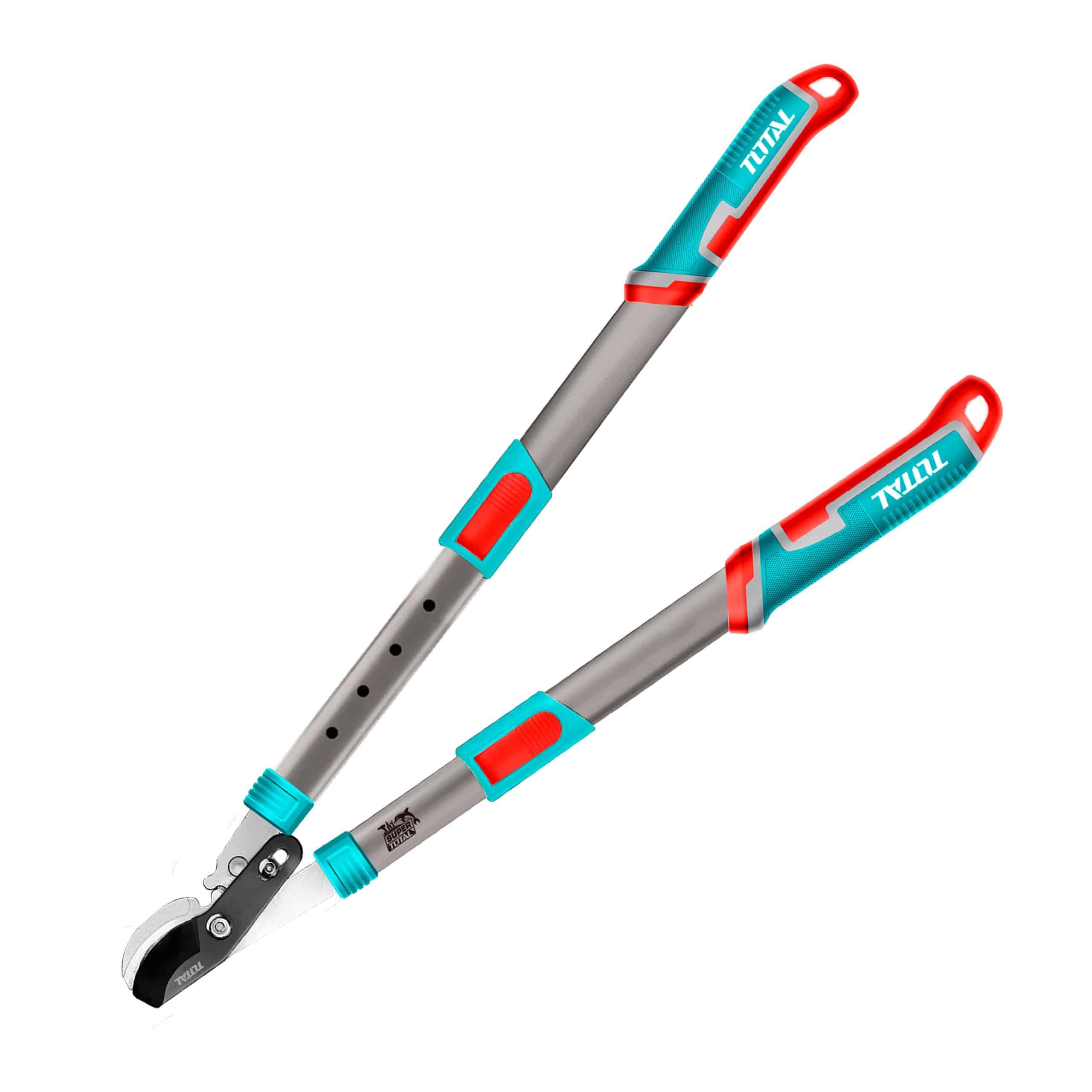 Tijera podadora Total con diámetro máximo de corte de 40 mm. Longitud ajustable de 660 a 870 mm. Diseño de derivación de engranaje para un corte más fácil y con menos esfuerzo. Cuchillas de acero